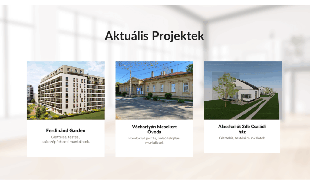 Főként új építésű társasházak, családiházak, lakások, közintézmények belső és külső kialakításában veszünk részt, itt gondolok a gépészetre, villanyszerelésre, hideg és melegburkolásra, szárazépítészetre, festésre, tetőfedésre, homlokzat szigetelésre és a burkolására.